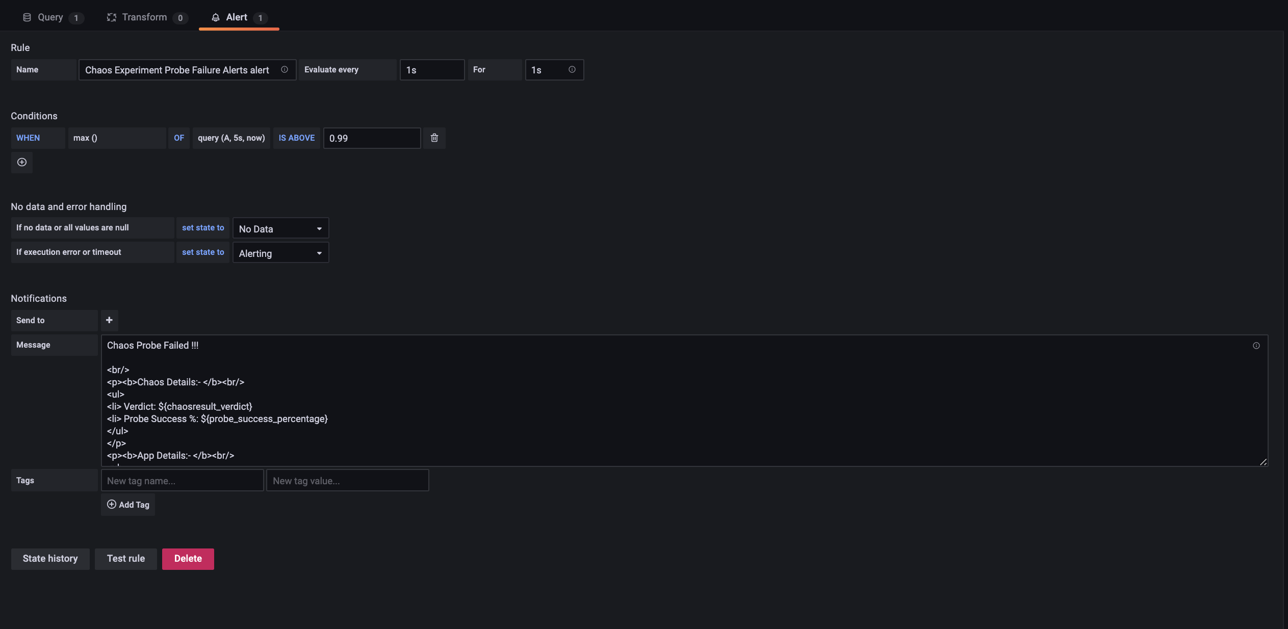 These alerts can be configured and triggered based on conditions set on panels using the litmuschaos_awaited_experiments and litmuschaos_experiment_verdict metrics. The same can be issued to various channels registered for the corresponding alerts on Grafana.